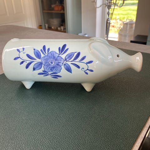 Hvid keramik pølsegris, der fungerer som en anderledes måde at servere spegepølse eller som en dekoration.