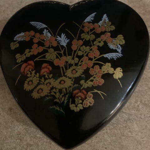 Æske i pap med hængslet låg. Æsken har et flerfarvet, marmoreret mønster i blå og brunlige nuancer samt en lille stofstrop foran til at åbne låget. Indvendigt er æsken ensfarvet og uden inddelinger, egnet til opbevaring af smykker eller småting.