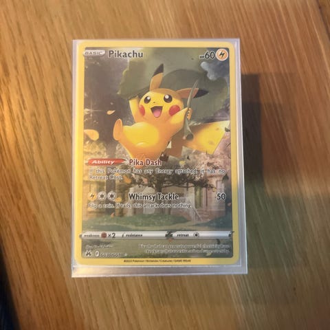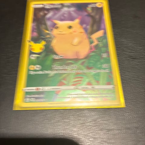Pokémon Birthday Pikachu samlekort. Kortet viser Pokémon-figuren Pikachu med fødselsdagstema og har 50 HP. Standard Pokémon-bagside med blå ramme og Poké Ball-logo. Velegnet til samling eller som del af et Pokémon-kortsæt.