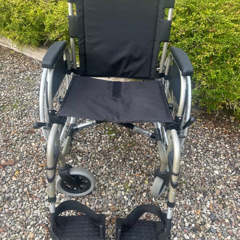 Sunrise Medical kørestol i sort. Kørestolen har store baghjul og mindre forhjul, aftagelige eller svingbare fodstøtter samt armlæn. Sæde og ryg er i tekstilmateriale (100 % polyester / PVC-overtræk). Modellen er sammenklappelig, så den fylder mindre ved opbevaring og transport. Velegnet som manuel kørestol til indendørs og udendørs brug, afhængigt af underlag.