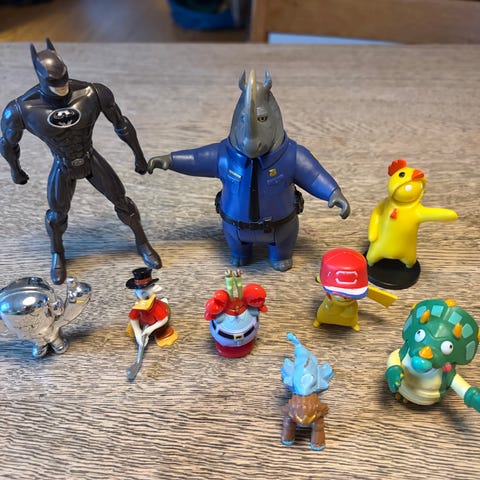 Blandet parti små figurer i plastik. Forskellige motiver og størrelser, primært farverige figurer velegnet som legetøj, samling eller dekoration. Leveres samlet som på billederne.