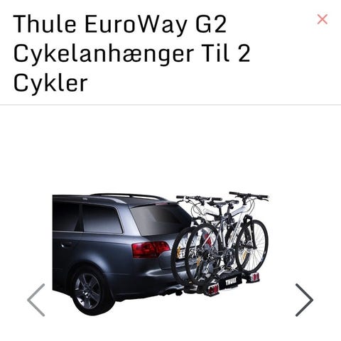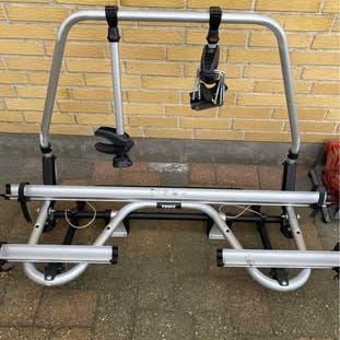 Thule cykestativ til bil med anhængertræk. Modellen er Thule Euroway G2, til transport af 2 cykler. Har vippe funktion for nemmere adgang til bagagerummet uden at tage stativet af. Alt kan låses fast med nøgle og justeres til alle typer cykler. Vi har eks. brugt stativet til minicykler De 4 skinner, der holder hjulene, kan justeres frem og tilbage efter cyklens størrelse og længde. Kan foldes sammen. Sælges kun, da vi har fået bil uden anhængertræk. Derfor er billeder fra en annonce, da jeg ikke kan vise det monteret.