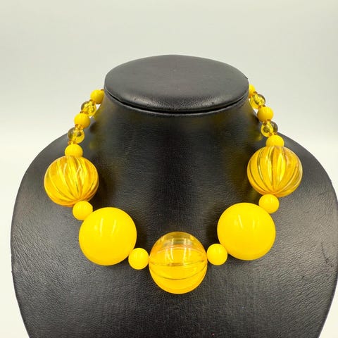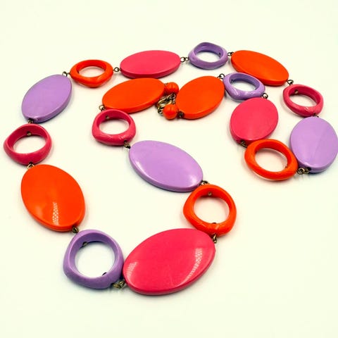 Lækker vintage halskæde med plastperler i blå og grønne nuancer. Jeg har flere på lager. Omkreds cirka 68 cm. Metal lidt mørknet. Ubrugt men vintage. Pæn stand. Lidt brugsspor.