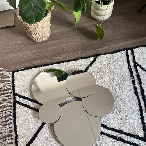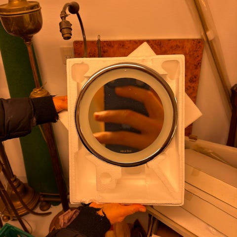Spejl med indbygget lys til vægmontering. Rundt spejl med lysring langs kanten og justerbar arm, så spejlet kan vippes og drejes efter behov. Velegnet som badeværelses- eller makeup-spejl, hvor der er behov for ekstra belysning tæt på ansigtet. Tilsluttes strøm via ledning.