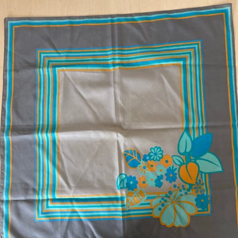Fint mindre tørklæde i blå nuancer. Virkelig flot mønster.