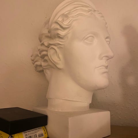 Buste skulptur i hvid farve. Klassisk hoved- og skulderfigur, velegnet som dekorationsgenstand i hjemmet, f.eks. på hylde, reol eller i vitrineskab.