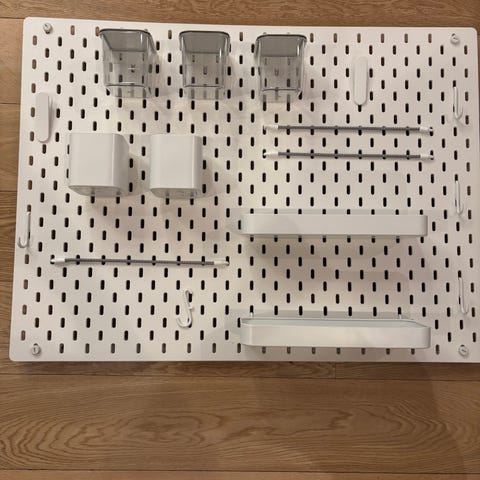 Væghængt opbevaringsløsning med mange forskellige løsninger og mange forskellige elementer. 3 store plader 76x56cm, 1 mellem plade 56x56cm og 1 lille plade 36x56cm.
