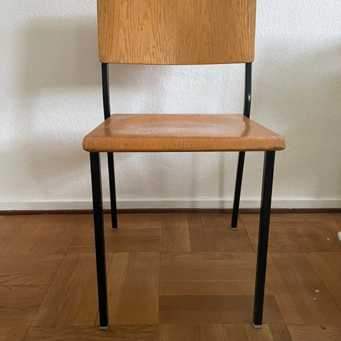 Fin skolestol fra genbrug med tryk af sardiner på. Købt i specialgenbrugsbutik, hvor forhandler selv har lavet de flotte tryk på stolen.