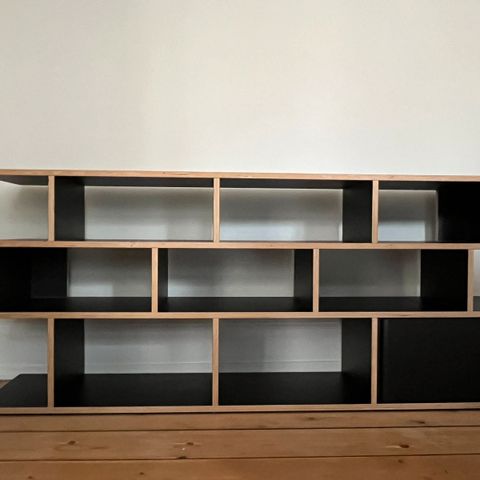 Stor, specialdesignet Tylko reol i terracotta. Reolen er bygget som modulopdelt væg‑til‑væg opbevaring med både åbne rum og enkelte skuffer nederst. Perfekt til bøger, vin, keramik, butik/café eller som markant møbel i stuen. Reolen er skilt ad i sektioner og pakket forsigtigt på palle med film omkring og er derfor relativt nem at transportere og samle igen. Den sidste sektion er ikke monteret på de viste billeder, men følger naturligvis med, så den samlede reol kommer til at ligne tegningen/manualen fra Tylko. Der er ca. 6 tydelige lakskader/chips i overfladen (se billeder) hvor man kan se spånpladen nedenunder som kom fra transporten til det lager hvor den er opbevaret nu. De er kosmetiske, men man skal kunne leve med dem eller udbedre dem med spartel og maling/reparationssæt. Ellers fremstår reolen i flot stand.
