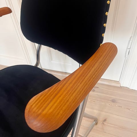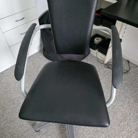 Den kan hæve og sænke, dreje og har justerbar ryglæn.