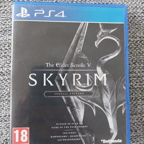 The Elder Scrolls V Skyrim VR Playstation 4 spil. Fysisk spil til PS4 i standard Blu-ray cover. VR-version af Skyrim, kræver Playstation VR-headset og kompatibelt PlayStation-kamera. PEGI 18 aldersmærkning.