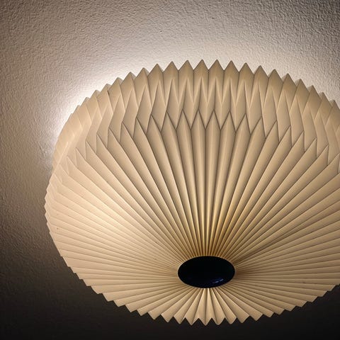 Fin fin lille lampeskærm i klokkeform med beslag/stativ. Diameter nederst ca. 20 cm. Pære/ledning medfølger ikke