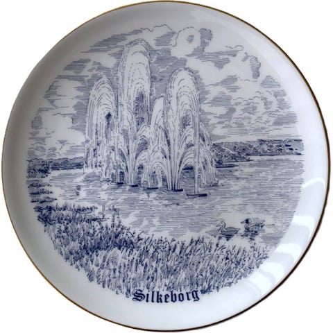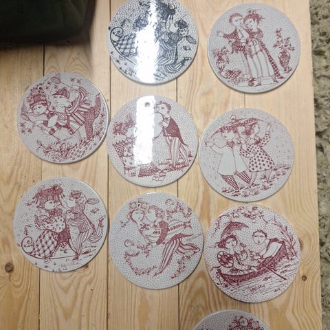 Sæt med fire runde relief vægplatter i hvid porcelæn. Motiverne forestiller klassiske figurscener med mennesker og naturdetaljer i ophøjet relief. Platterne har en glat kant og ophæng bagpå, så de kan hænges direkte på væggen. Velegnet som dekoration i stue, spisestue eller entré, enkeltvis eller samlet som serie på væggen.