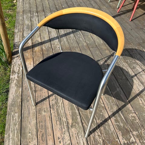 Spritny, smuk stol designet af Henrik Tengler. Armstol model Chairman med stel af børstet stål, formbøjet kopstykke af ahorn, sæde og ryg betrukket med sort alcantara. Formgivet i 1991. Fremstillet hos Hansen & Sørensen.