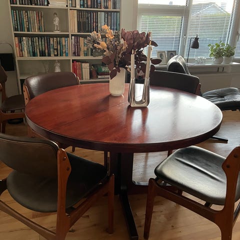 Spisebord med 2 tillægsplader i bejdset eg fra 60'erne, det fremstår i en ok stand med brugs spor uden det er graverende.