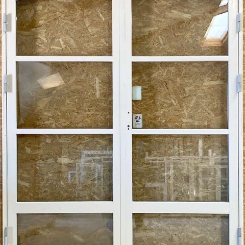 Brugt Rationel Dobbelt Terrassedør, Alu/træ, 2 lag glas, hængt på begge sider, udadgående, udluftning, hårdttræsbundstykke, kan låses med nøgle på indersiden, nøgle medfølger ikke, mål: H228,2 B159 D12,5 Varenummer: 1696