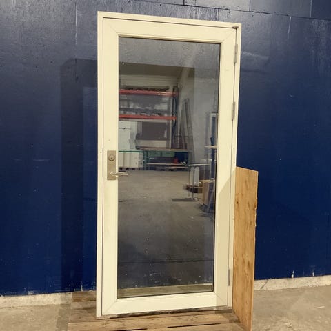 Brugt Idealcombi Yderdør, Alu/træ, 2 lag glas, hårdttræsbundstykke, højrehængt, indadgående, mål: H214 B94,5 D12.3 Varenummer: 1702