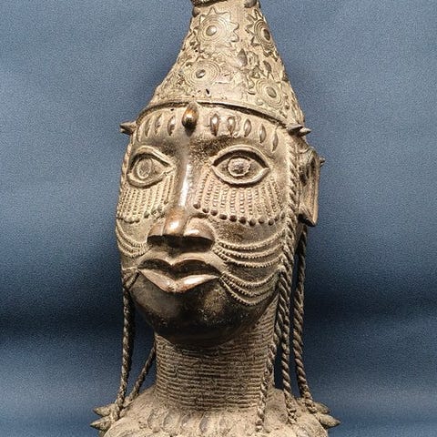 Bronzestatue af en ridder fra Mali, oprindelse Soninké/Djenné, fra midten af det 20. århundrede, 11 cm høj, 2 cm bred, 10 cm dyb, vejer 270 g, provenance Collection privée, i god stand, uden stand, med en lansze med en af tiden slebet æg, og en brugss patina. Klik på den blå "gå til varen" knap, for at købe eller byde på denne vare. Den samlede pris vil blive vist inden du afgiver dit bud.