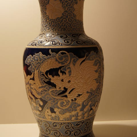 Vasen har en naturligt ældet crackle-glasur og påførte keramiske relief-elementer, udført i samme porcelænslegeme og afsluttet med en mørkere glasur. Disse