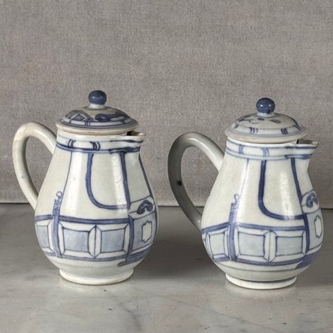 Periode: Alle fra Qing-dynastiet i det 18. århundrede, “den blå- og hvide Yongzheng-periode.” De andre to er fra det 19. århundrede.