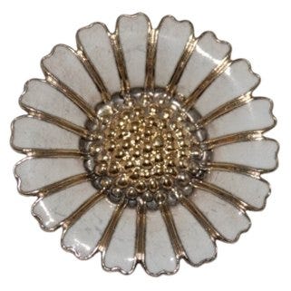 Så snart vi ser den, forstår vi hvorfor: denne broche skiller sig ud. Dens store størrelse og strålende design glitrer takket være 24 karat guldplet, der fanger lyset med intensitet. De polerede overflader reflekterer glansen, de børstede områder blødgør den, og de udvidede stråler skaber en lysende «sunburst»-effekt.