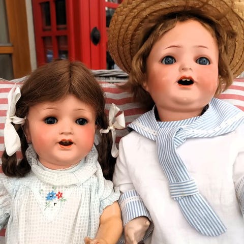 To All Bisque Heubach-figurer, hver ca. 10 cm lang og 13 cm høj, fremstillet i Tyskland og mærket 49748 Heubach med blå intaglio-øjner, der kigger til højre, formet hår med flets, originale lyseblå og pink bånd, i god stand og uden original emballage. Klik på den blå "gå til varen" knap, for at købe eller byde på denne vare. Den samlede pris vil blive vist inden du afgiver dit bud.