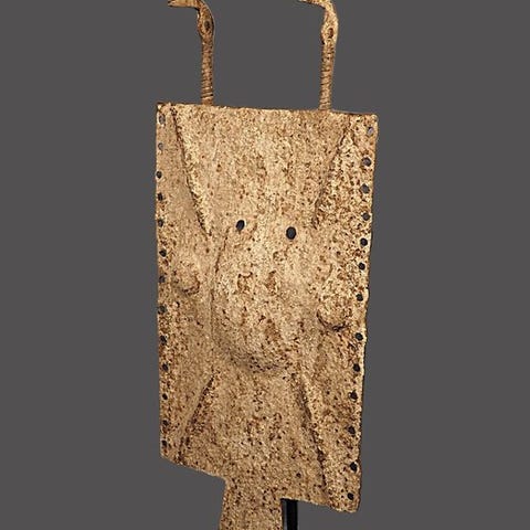 Meget udtryksfuld og stor trædyremaske fra Gurunsi-folket i Burkina Faso. Den repræsenterer både en krokodille og en hane. Dyremaskerne blev brugt af Gurunsi-folket i Burkina Faso i Do-tilbedelsen. Dyrene repræsenterer naturguder, som kan kommunikere med mennesker gennem maskerne. Formålet med dette var at opmuntre guddommen Do til at bringe regn og frugtbarhed. Desuden blev maskerne også båret under begravelses- og indvielsesceremonier. I dag udføres maskedanse udelukkende for underholdning.