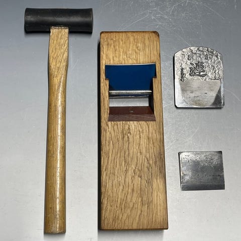 Tataki Oire Nomi værktøjsæt til bænkpudser, standard sæt af fem lange håndtagshøvle, fremstillet i Japan af stål med egetræs huller, i god stand med tegn på aldersrelateret slitage og pletter og herunder 7, 9, 15, 24 og 48 mm bænkehøvle samt en langslibet 24 mm høvl. Klik på den blå "gå til varen" knap, for at købe eller byde på denne vare. Den samlede pris vil blive vist inden du afgiver dit bud.