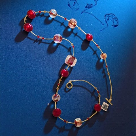 Elegant vintage halskæde af Murano-glas, kendetegnet ved store runde perler i intens rød farve med raffinerede interne åretegninger, typiske for det muranske håndværk.