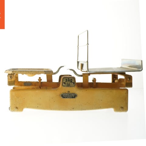 Smukt eksemplar af en professionel mekanisk vægt "Italiana", produceret af den historiske virksomhed Macchi Francesco di Santo Stefano (Varese). Et ægte stykke historie inden for italiensk industriel design, karakteriseret ved en elegant linje og en robust metalstruktur med en tidløs charme.