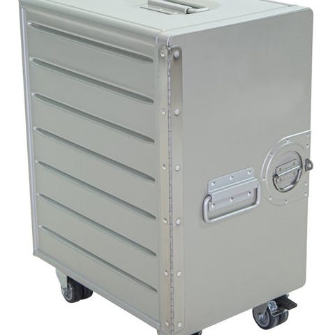 De XL-enhed med hjul er lavet af en original ny galley-container i originalt format og sølvfarvet anodiseret aluminium.