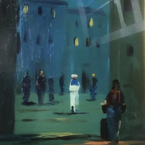 Oliemaleri på faesite af den bergamaskiske maler fra det tyvende århundrede, Nazzareno Vitali. Hans foretrukne motiver er masker og arlecchini.