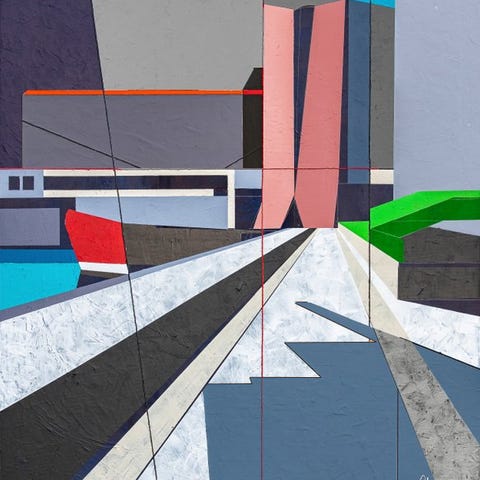 Teknik: digital collage trykt på lærred, håndpåført akrylmaling og lak.