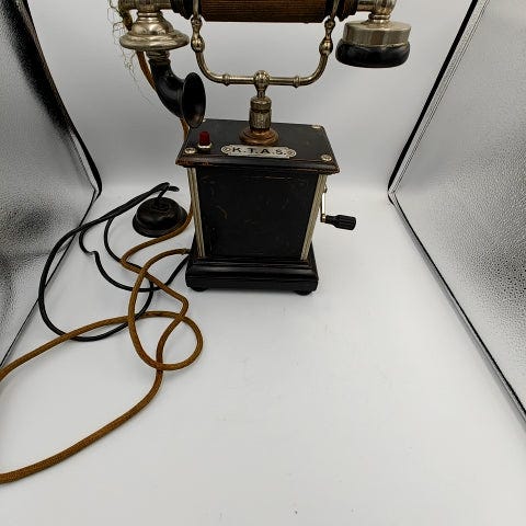 Italiensk oprindelse, telefon fra 1960’erne omdannet til en grøn LED lampe, med PVC, messing og metaldele, dybde 20 cm, bredde 15 cm, højde 34 cm, vægt 3 kg, i funktion og i god brugt stand med mindre aldersmærker. Klik på den blå "gå til varen" knap, for at købe eller byde på denne vare. Den samlede pris vil blive vist inden du afgiver dit bud.