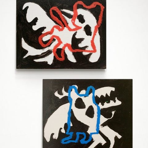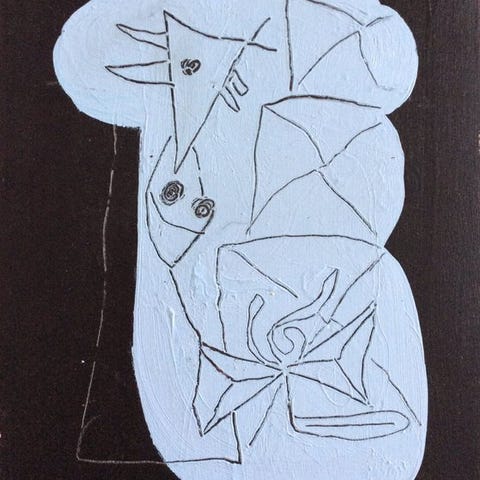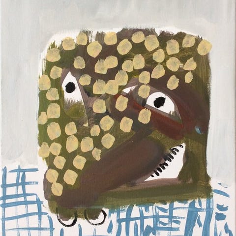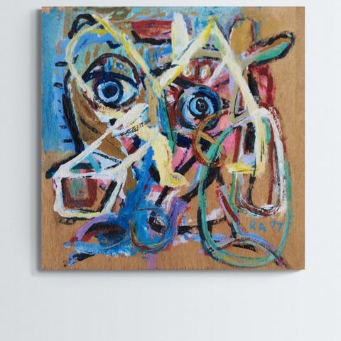 Dette lille maleri på træ er centreret omkring et ansigt set forfra, opbygget af overlappende farver og tykke linjer. Tre øjne udgør kompositionen: to på ansigtet, et tredje midt i panden, som et ekstra spændingspunkt, der straks flytter læsningen mod et mere symbolsk udtryk end anekdotisk.