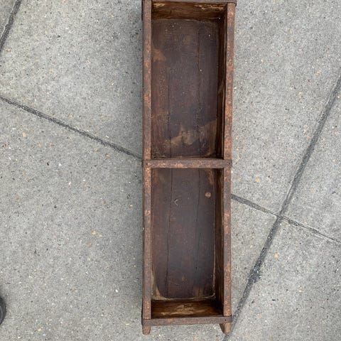 Håndformet murstenform til fremstilling af syv mursten, af egetræ og stål, dateret 1940–1950, Nederlandene, 97 cm høj, 26 cm bred, 7 cm dyb, vægt 6,3 kg, model 7 vaks, i god stand med mindre tegn på ældning. Klik på den blå "gå til varen" knap, for at købe eller byde på denne vare. Den samlede pris vil blive vist inden du afgiver dit bud.