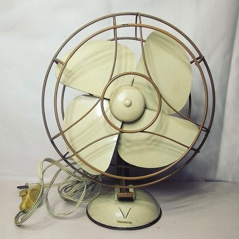 Stor, tung ventilator af mærket Indola model TV-11 fra 1950'erne. Fremstillet i Nederland.