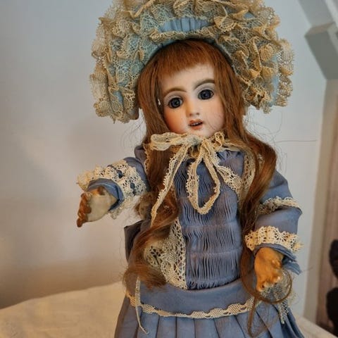 Preciosa dukke fra det franske marked med original mekanisme til øjenåbning, størrelse 6, måler 35 cm, vurderet som enestående i dukke-bøger. Den har hår på den øverste del af panden og er ikke blevet restaureret.