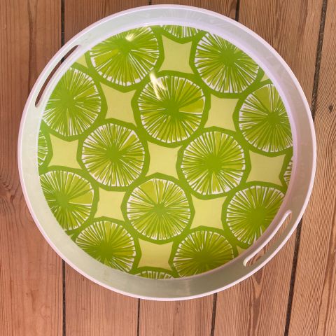 2 sek. Marimekko Zakti serveringsbakke i rundt design. Bakken er hvid med stort sort blomstermotiv og kontrastfarvet midte. Egnet til servering af drikkevarer, mad eller som dekorativ bakke i køkken og stue. Fremstillet i et hårdt, glat materiale, der er let at tørre af efter brug.