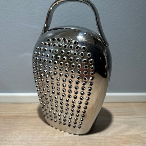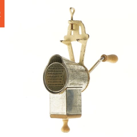 Ikonisk Quick Mill rødt rivjern fra 1960'erne, komplet med den emaljerede plade, med en bearbejdet glasopsamler, og de resterende dele i emaljeret metal.