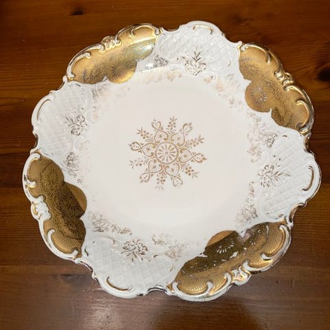 Servicen har et klassisk og tidløst design: en lys hvid bund, indvendig kobaltblå kant og en gylden kant langs profilen, omhyggeligt udført. De let facetterede former giver den karakter og raffinement, og gør servicen ideel både til et formelt bord og til daglig brug i elegant stil.