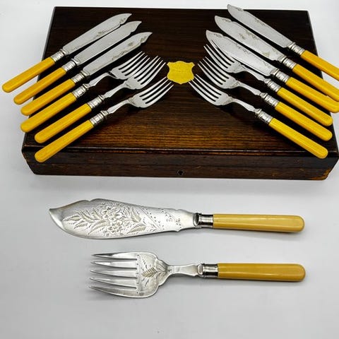 Fiskserveringssæt (2) - Stort format antikt bestik - Forsølvet