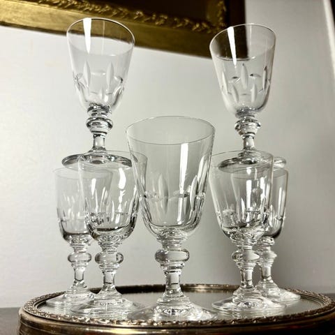 Smukt sæt bestående af 20 identiske, originale krystalvinsglas fremstillet af den berømte belgiske krystalfabrik Val Saint Lambert. Disse elegante glas daterer sig fra 1930'erne i det 20. århundrede og er et smukt eksempel på den forfinede glasdesign fra mellemkrigstiden.