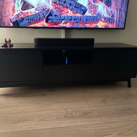 Sælger dette stilrene og rummelige TV-møbel i sort højglans. Møblet har et moderne design og passer perfekt ind i de fleste stuer. God opbevaringsplads med skuffer og åbne rum, ideelt til elektronik, spillekonsoller m.m.