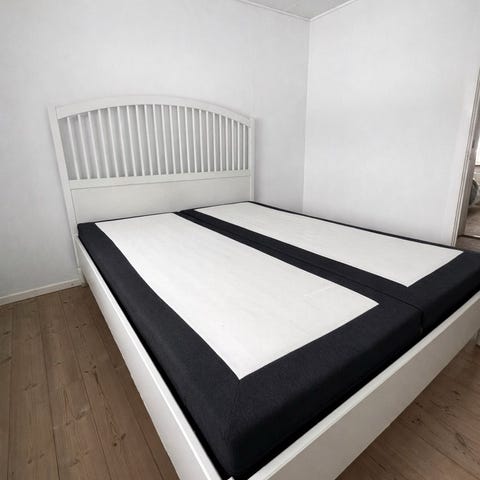 IKEA seng i hvidt træ med hovedgavl med sprosser og fodgavl med glatte paneler. Sengen har en længde på ca. 211 cm og en bredde på ca. 154 cm. Hovedgavlen er ca. 120 cm høj, og fodgavlen er ca. 66 cm høj.