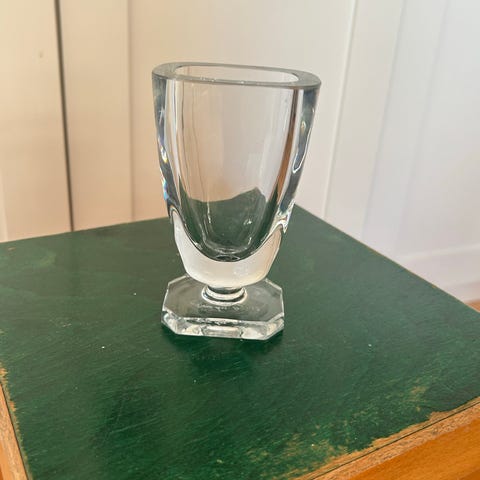 En glasvase på 17 cm i højden fra det svenske glasværk “Strömbergshyttan”. Vasen har et lille nag på kanten, se sidste billede.