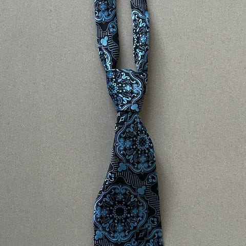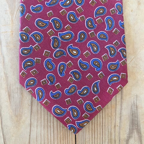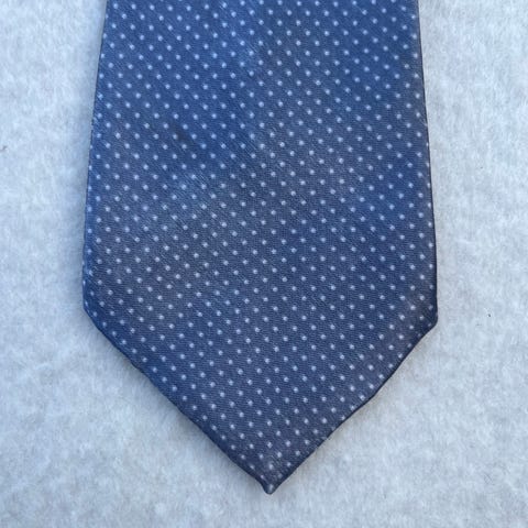 Gold City slips til mand i håndlavet silke. Slips i blå farve med diagonale striber i hvid og rød samt små røde mønstre. Klassisk model egnet til brug sammen med skjorte og jakkesæt ved formelle og semi-formelle lejligheder. Nederste del af slipset viser tegn på slid eller misfarvning, som bør tages i betragtning ved køb.