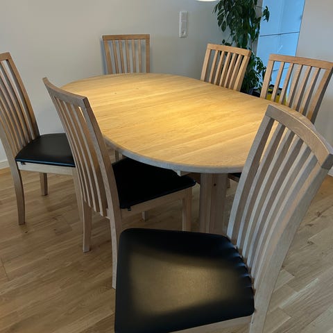 Flot stort spisebordssæt med 6 stole og ekstra plade gives væk