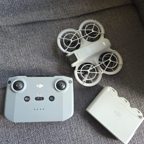 Dji Neo drone med DJI Goggles N3 og RC Motion 3-fjernbetjening samt to ekstra batterier og lader til alle 3 batterier på samme tid.