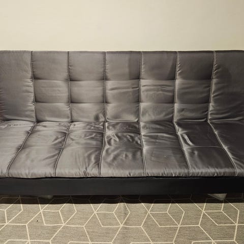 Blåsort futon madras på sort metal stel. Kan slås ud til seng. Rum til Opbevaring under madras.